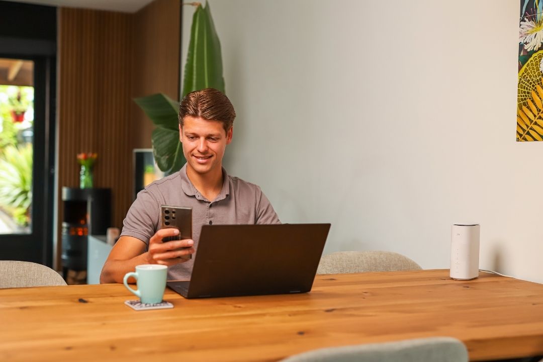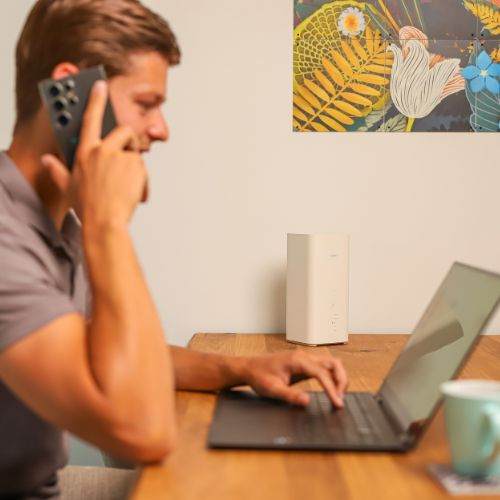U ontvangt een 5G-router die direct klaar is voor gebruik. Valt uw vaste internet weg? Dan verbindt u uw apparaten met het backup-netwerk. Geen installatie, geen wachttijd.